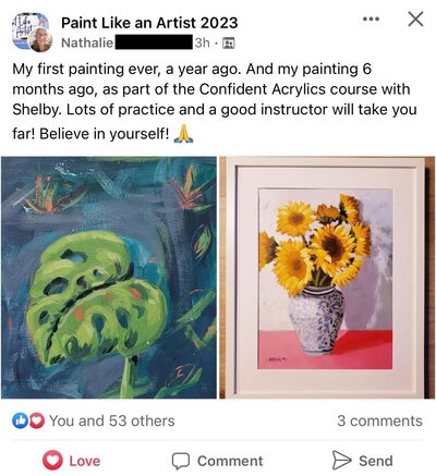 One of the best decisions I've made since retiring 4 years ago was to take Shelby's Confident Acrylics class January of 2024...I can't get over how much I learned and that you really can learn this skill and don't have to be naturally "gifted" at painting. Shelby's process is so simple yet brilliant! Her teaching style is so encouraging, especially for those with absolutely no previous experience. I surprised myself (and my friends and family) with my work and continue to do so as I keep at it! I even had my first commissioned piece last year and was extremely proud of that accomplishment! Still seems unbelievable! - Ann